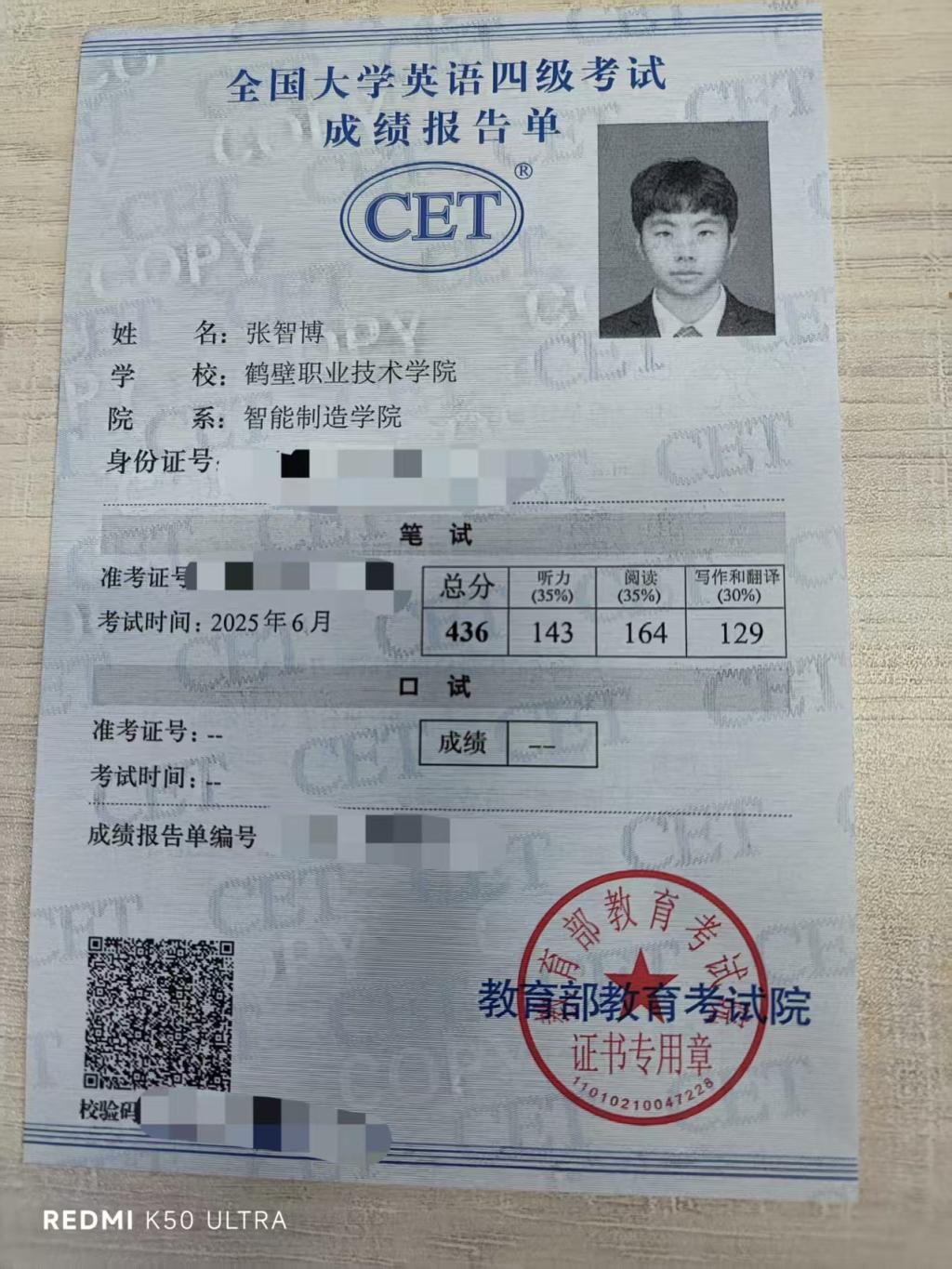 近日,全国大学英语四级考试(CET-4)成绩揭晓,我院2023机电1班张智博同学以436分的优异成绩顺利通过考试,为我院学子树立了勤奋好学、勇攀高峰的榜样。